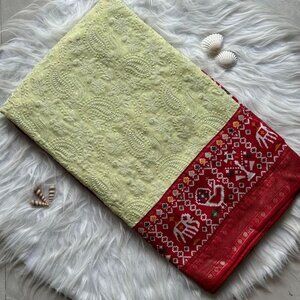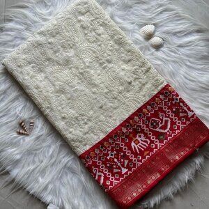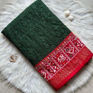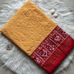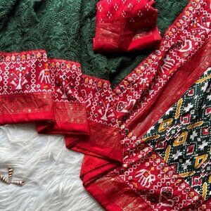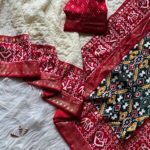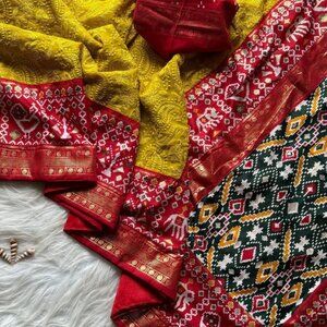 With fusion of Rich Patola foil printed border and pallu with handwoven exclusive ball tassels🧶
