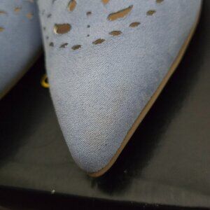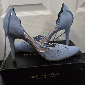 christian siriano for payless powder blue suede lace-up heels with perforated detail. worn twice, slight discolouration on the toe-see photos.