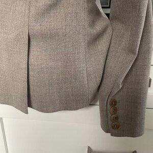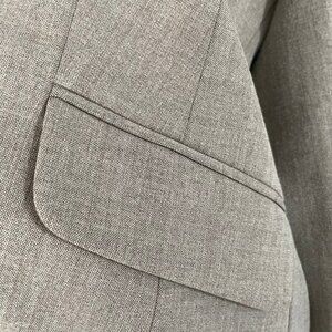 Features: double breasted, notch collar, front flap pockets, lined, 4 button detail on cuffs, single back pleat, lightly padded shoulders, polyester, viscose, neutral, office