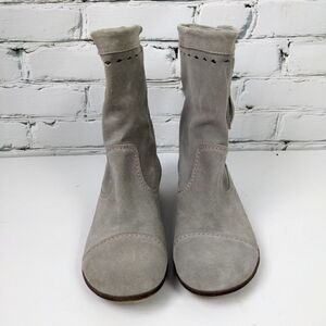 Super round toe with really nice quality suede. The heel has cork detail. there are little cutouts at the top and a cute tassle.