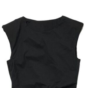 This is a sleeveless crew-neck bodysuit with shoulder pads and a full-cut bottom. Luxe, ultra-flattering fabric. Super versatile edgy peice, Perfect for the office, date night, or drinks with friends.