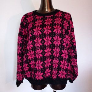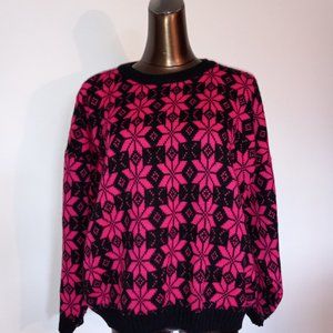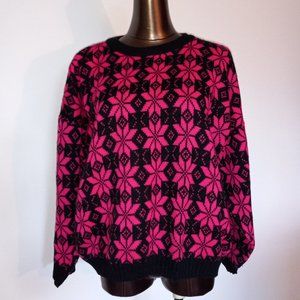 Here is one from the 1980s; a quazi-snowflake, floral print in hot pink and black acrylic yarn.