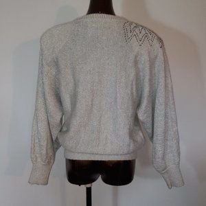 This 1980s gem is silver acrylic yarn with silver metallic thread, and beads and sequins details on the right shoulder. Original shoulder pads intact.