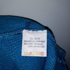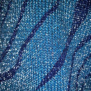Again, acrylic yarn can be your friend! This tourquoise zebra sweater has silver metallic thread woven through it. Wide crew neck. Loose, drop shoulders with original pads.