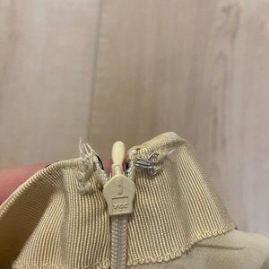 Hidden hook-and-eye closure (loop is torn, can be easily repaired/does not impact fit of skirt) and zip at side