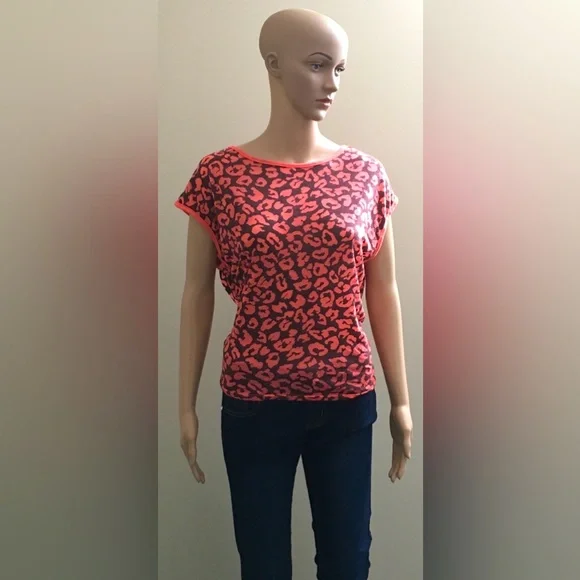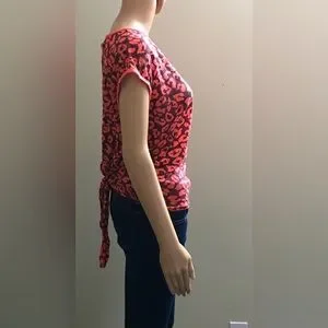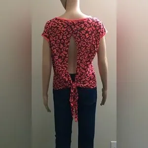 Salmon & Black Animal Print Top with Ties at the Bottom of an Open Back Design