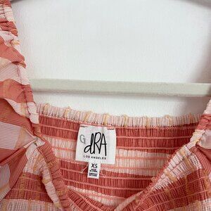 A youthful midi dress in a Peach Stripe organza, this DRA Los Angeles dress features tiered ruffle skirt, puff sleeves and is cut in a soft, textured woven fabric. Its rounded neckline adds an eye-catching touch to this loose fitting style. A maxi dress for shorter height and midi dress for taller height.