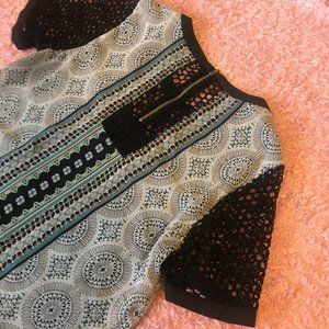 Blue and turquoise in a Moroccan influenced pattern with a lovely black lace yoke. This dress is fully lined. Both exterior and interior are 100% polyester.