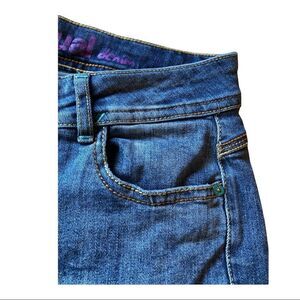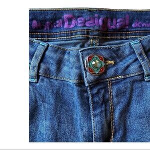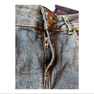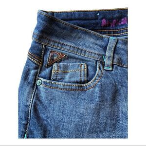These jeans are just adorable with a colourful metal fly fastener to the special attached pouch at the back with extra fastener materials. In excellent pre-owned condition, low rise, straight leg, a bit skinny with some stretch, size 28, See measurements.