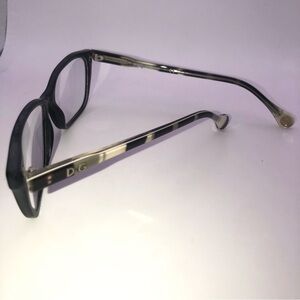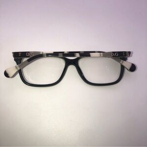 D&G Eyeglasses frames - prescription is unknown - just selling for the frames - lenses can be replaced for your own prescription in stores. Green cream / beige black striped arms - black frame around lenses.