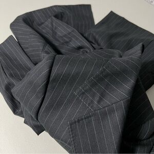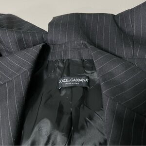 Black stretch-virgin wool pinstripe slim-cut buttoned blazer from DOLCE & GABBANA featuring pinstripe pattern, peak lapels, front button fastening, chest welt pocket, front flap pockets, long sleeves, buttoned cuffs, white pinstripe print lining on both arms and black lining with Dolce & Gabbana prints on the body and central rear vent. Padded shoulders.