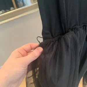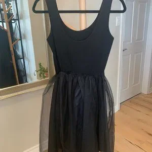 Fun black cocktail dress. Size small. Knit jersey top, tulle lined bottom. Has loops for a belt but belt is missing. Loops could easily be cut off. Never worn.