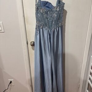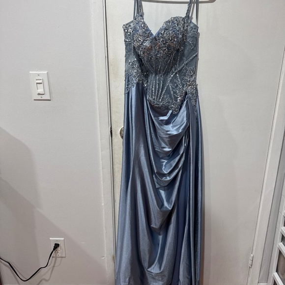 I bought this dress for $500 it is brand new only worn for a day! I have a triple D bust dress fits it’s a corset like top really snatches the waist. It is in brand new condition. It is a blue colour. I am 5’3 and it fits well with heels! It is longer in the back giving a train. And there is a side piece which is beautiful and long I tried to show in the photos. I’m asking for $400 OBO I can negotiate a good price for this beautiful dress. It is a size 14