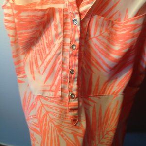 beautiful dynamite blouse sz small lovely pinky/orange leaf print sleeveless and buttons down with 4 buttons, 2 pockets on front, very sheer material great for warm days fresh wash and steam !