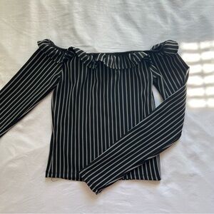 off the shoulder pin striped black and white top with ruffled hem