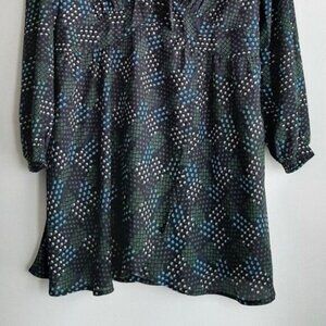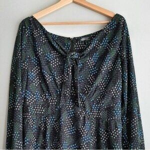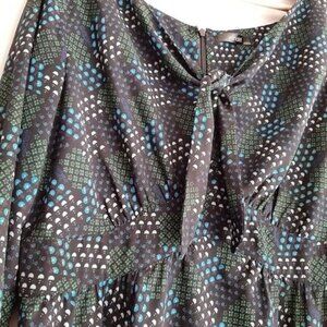 • Long sleeve empire waist dress in blue, white and green abstract flower pattern on the black background. Back zipper closure.