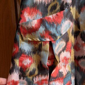 Stand out in this vibrant and stylish dress from eShakti! Featuring a bold ikat-inspired multicolour print, this flattering fit-and-flare silhouette includes cap sleeves, a belted waist, and oversized patch pockets for a playful, utilitarian touch. The dress zips up the back and is fully lined in a bright green fabric for a fun surprise detail.