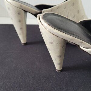 Open toe mules, light gray ostrich-patterned leather, 3.5" round leather-wrapped heels; looks perfect with pencil skirt or peeping out from straight-leg jeans.