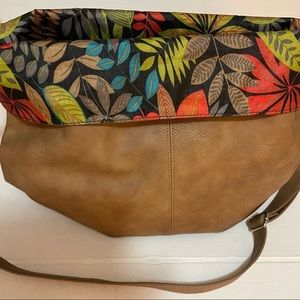 Espe Vegan Leather Large Crossbody Satchel, Hobo Bag, Botanical Interior, zip pocket on back, zip pocket inside, washable botanical material inside, in excellent condition