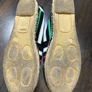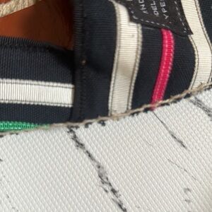 Wore 3 times. MBMJ, Navy with Pink, White and Green stripes, Fabric Shoes with rope like fabric on the bottom