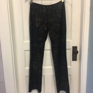 Vintage Express elastic waist pants in snake/reptile print with a bit of shine. Fitted through upper leg and flare at bottom and a slit in hem at back. Perfect to pair with platform boot.
