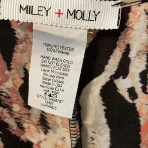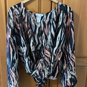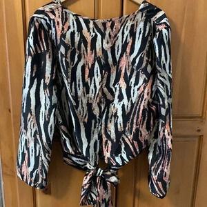 Cool too! Faux wrap slinky blouse that ties in the back! Deep V neck. Animal pattern with P black, cream and orange-peach. Size Large. Fun for a party and night out!