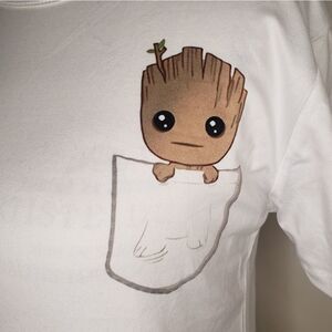 White fitted crewneck tshirt with Baby Groot print faux front pocket, from Marvel's Guardian's of the Galaxy.