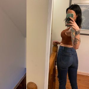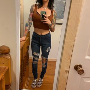 I love these jeans, I just don’t reach for them enough. They hug all the right curves and have some stretch. They are very destroyed. For reference I’m a 27” waist and 5”6. Thanks for looking 🌸