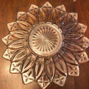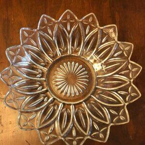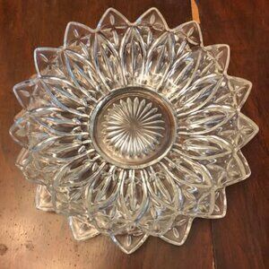 Clear glass fruit bowl and matching plate with sunflower shaped accent in middle, leaf shape inner and pointed edges around outer rim. Matching plates has identical design