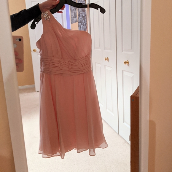 - pale pink - just above the knees (4"10) - 24 inch waist - bought from best for bride - worn once