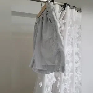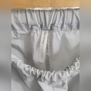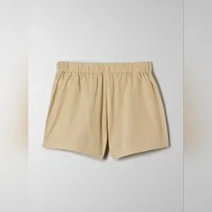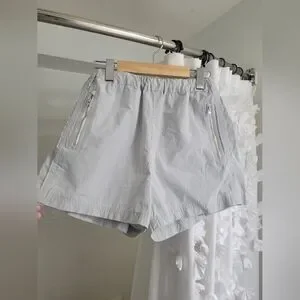 These are high-rise shorts with front zip pockets and an elasticized waist. They’re made with structured, Italian cotton-blend fabric.
