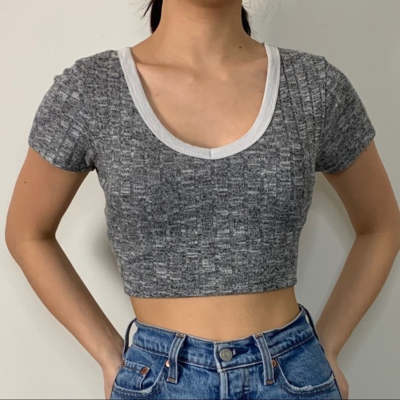 form american dream, this is a women’s basic heather grey short sleeve scoop/v-neck t-shirt with white contrast by the neckline. it’s made of light fabric that offers a good amount of stretch.