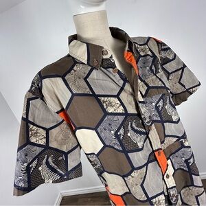 Stylish men's shirt featuring a geometric pattern in black, gray, and orange. Perfect for casual outings or a night out. Stand out with this unique design.