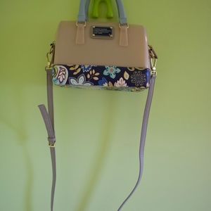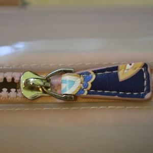 An authentic Venuco Madrid handbag. This gorgeous purse is 8inches long by 7inches tall. With a detachable and adjustable long shoulder/ cross-body strap, this fun-sized purse is perfect for a sunny statement. It features a strong rectangle bottom in a blue floral print which provides the bag with a sturdy structure. It has a blush pink rubber/plastic top and gold-colored metal features. This purse offers two fully functioning zippers to seal in the handbag. Inside, the pure offers lots of open