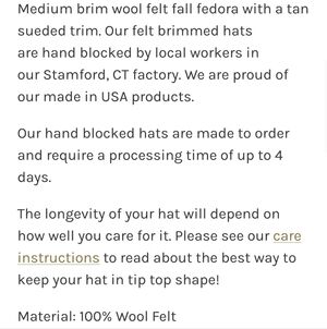 *no longer available in this timeless style, model & text show their 'Classic Amelia' Fedora which is very similar style and fit, Org $200USD, wears well through Spring, Summer & Fall!