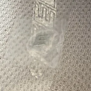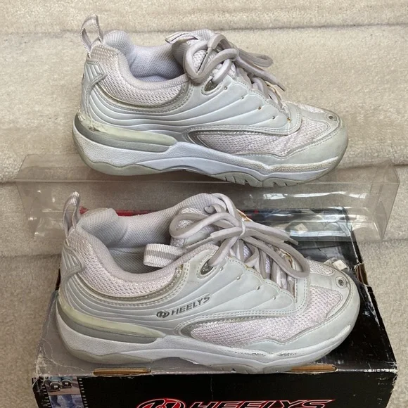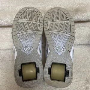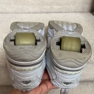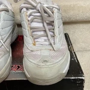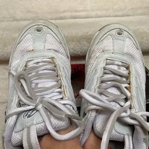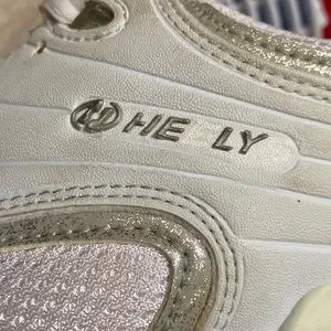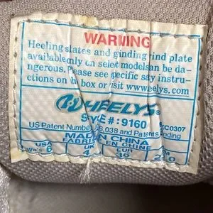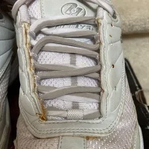 good used condition, there’s marks on the shoes from being worn/used (see photos), discolouration of the glue on the shoes (yellow/orange), the E fell off on the left shoe but can be glued back on, it’s taped into the insole of the left shoe, there’s light wear on the left back heel (see photo)