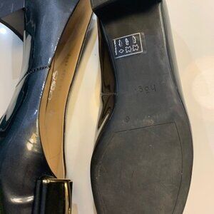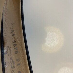Sophisticated, classic pump with rounded toe worn only ONCE ... darn bunion:-(. Dark grey patent leather w/complementary dark grey cloth bow embellishment framed in gold-coloured metal. (NOTE: They LOOK A BIT DARKER in the photos.) Heel height approx. 1.4" or 3.5 cm. Austrian shoe brand. Made in Hungary. Comes with original box and shoe covers.