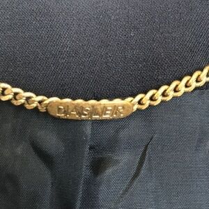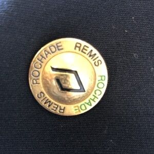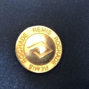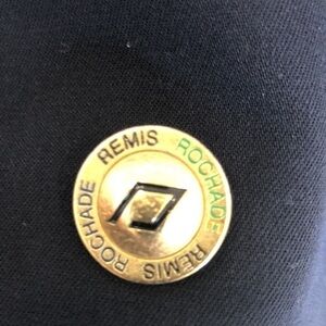 Classic blue blazer with gold tone buttons. Shoulder pads. No lapels. Double breasted to single button closure at waist. Flap pockets. Buttons at cuffs. Cropped length with notch at back hem. Extra buttons are secured inside. Buttons embossed with “Remis Rochade” with varying degrees of green and blue color. See pics Missing composition and size labels. Wool blend. Pit to pit 18”. Length from shoulder to hem 21”.
