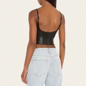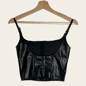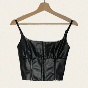 The h:ours Doyle tank is a black faux leather cropped bustier-style top with adjustable spaghetti straps. It features a square neckline, a structured bodice with panel detailing, and a front hook-and-eye closure running down the center. The fit is form-fitting, emphasizing the waistline, and it pairs well with high-waisted bottoms for an edgy, modern look.