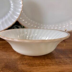 A classic example of mid-century American glassware by Anchor Hocking, this swirl design with gold edging is increasingly rare to find in such well-preserved condition. These pieces are oven-proof and marked accordingly.