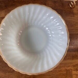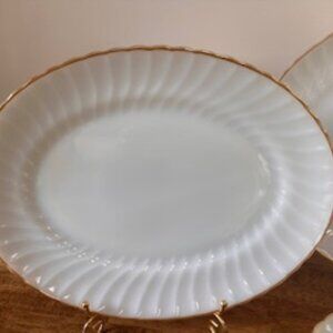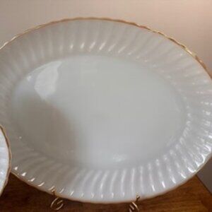 This elegant three-piece set of vintage Anchor Hocking Fire King milk glass features a beautiful swirl pattern and delicate gold trim along the edges. These pieces were produced in the USA and exemplify the quality and charm that Fire King glassware is known for. This particular set includes a generously sized serving bowl and two matching oval platters โ perfect for holidays, entertaining, or everyday elegance.