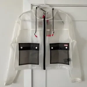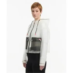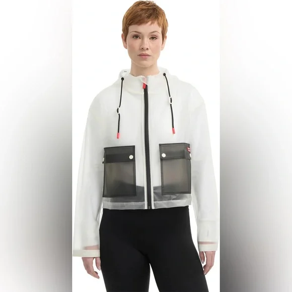 Experience the ultimate blend of style and functionality in the Jessie matte transparent cropped jacket. With a color block design, permanent hood, contrast patch pockets, and red Hunter signature accent details, it will elevate any look.