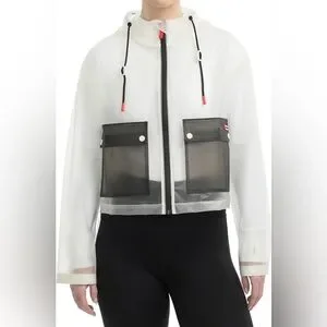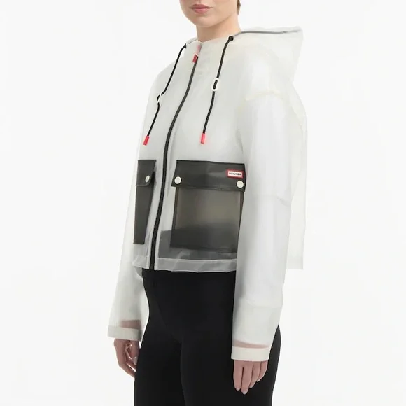 Experience the ultimate blend of style and functionality in the Jessie matte transparent cropped jacket. With a color block design, permanent hood, contrast patch pockets, and red Hunter signature accent details, it will elevate any look.