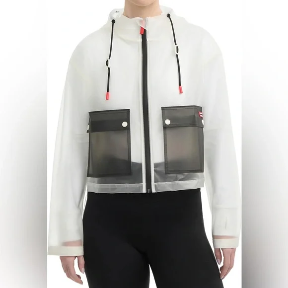 Experience the ultimate blend of style and functionality in the Jessie matte transparent cropped jacket. With a color block design, permanent hood, contrast patch pockets, and red Hunter signature accent details, it will elevate any look.