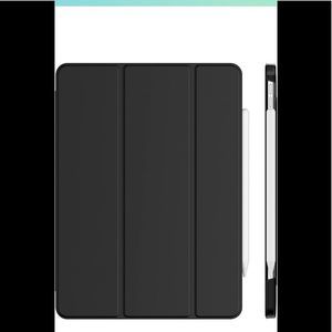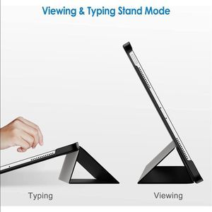Magnetic smart cover supports automatic sleep/wake function. The tri-fold front cover can support iPad in two standing positions for viewing and typing
