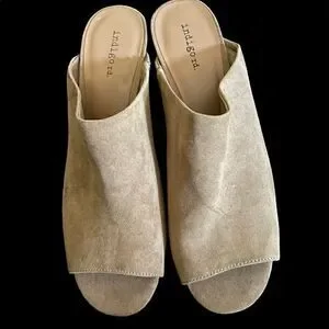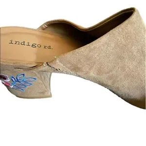 Beautiful slip on indigo Road sandals 3 inch heel. Beautiful embroidery on the back of the heels as shown in the pictures there’s absolutely no wear on the back of the heels or on the bottom of the shoe. really they were just worn in the house to try to get used to them and they were just a bit too high for me. On the inner of each shoe there’s a little slit in the shoe that has elastic that is supposed to be there, it just gives the shoe a little bit of give when you’re walking. These are a size 10. And There’s a tiny little Nick out of the right shoe where the foot slides in you’ll never see it when you’re wearing it. Shown in pic 5