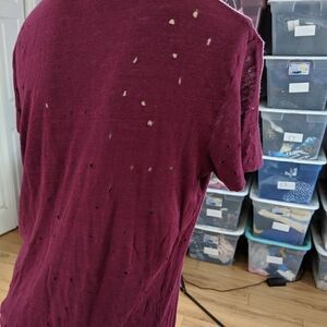 Burgundy tee with distressed holes .