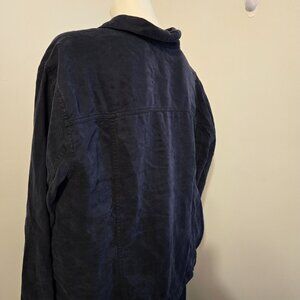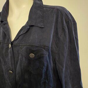 Navy blue is a little warmer than a blouse and less warm than a coat.