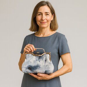 Introducing this elegant handmade clutch, a timeless accessory that blends vintage charm with modern sophistication. The delicate watercolor-style floral pattern in soft shades of grey and black creates a refined, artistic look—perfect for weddings, evening events, or a chic daytime outing.