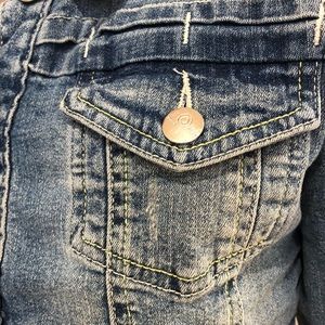 jean jacket with 4 pockets outside. two pockets inside. button up. slightly distressed. button cuffs. collar.